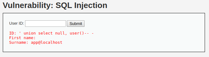 We have used null as one column since we need to match the number of columns from the server query which is two. null will act as a dummy column here which will give no output and the second column which in our case here is the version() command will output the database version. Notice the output from the application, nothing is shown for First name since we specified null for it and the maria db version will be displayed in Surname.
